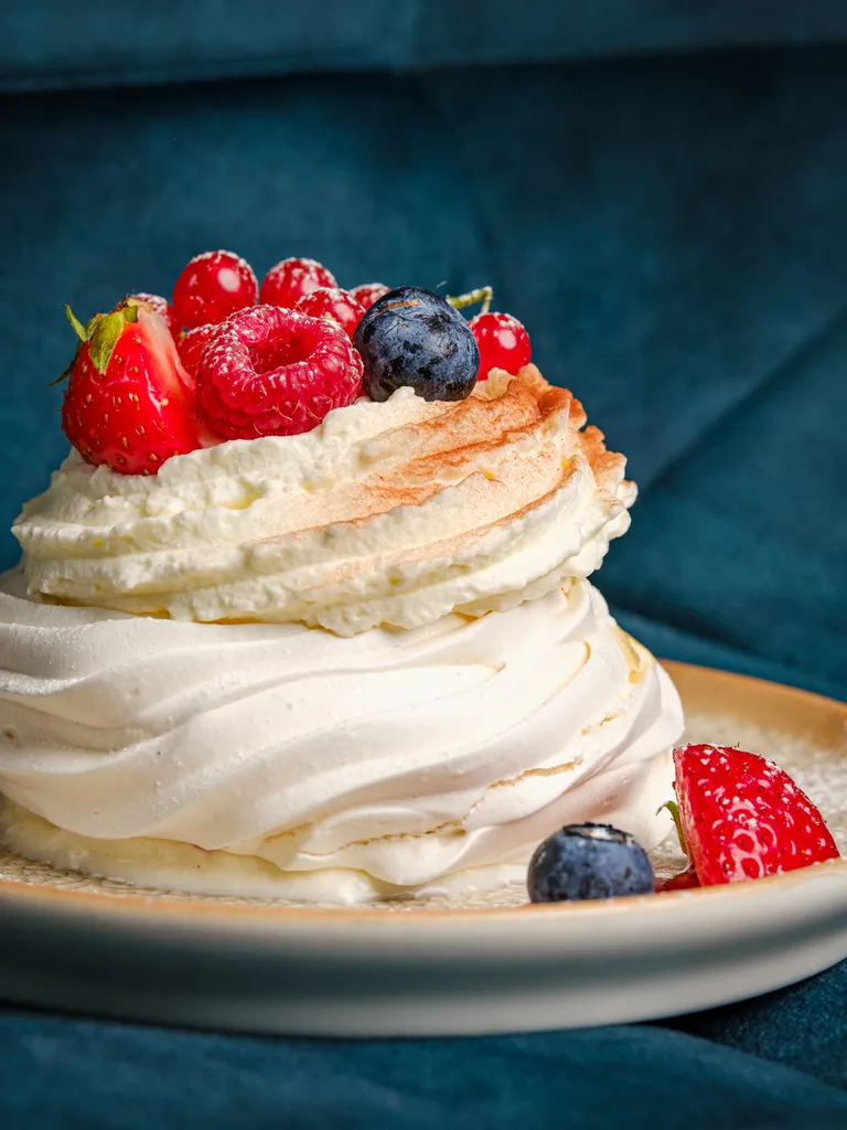 Meringue croustillante et fondante, crème chantilly & fruits frais.