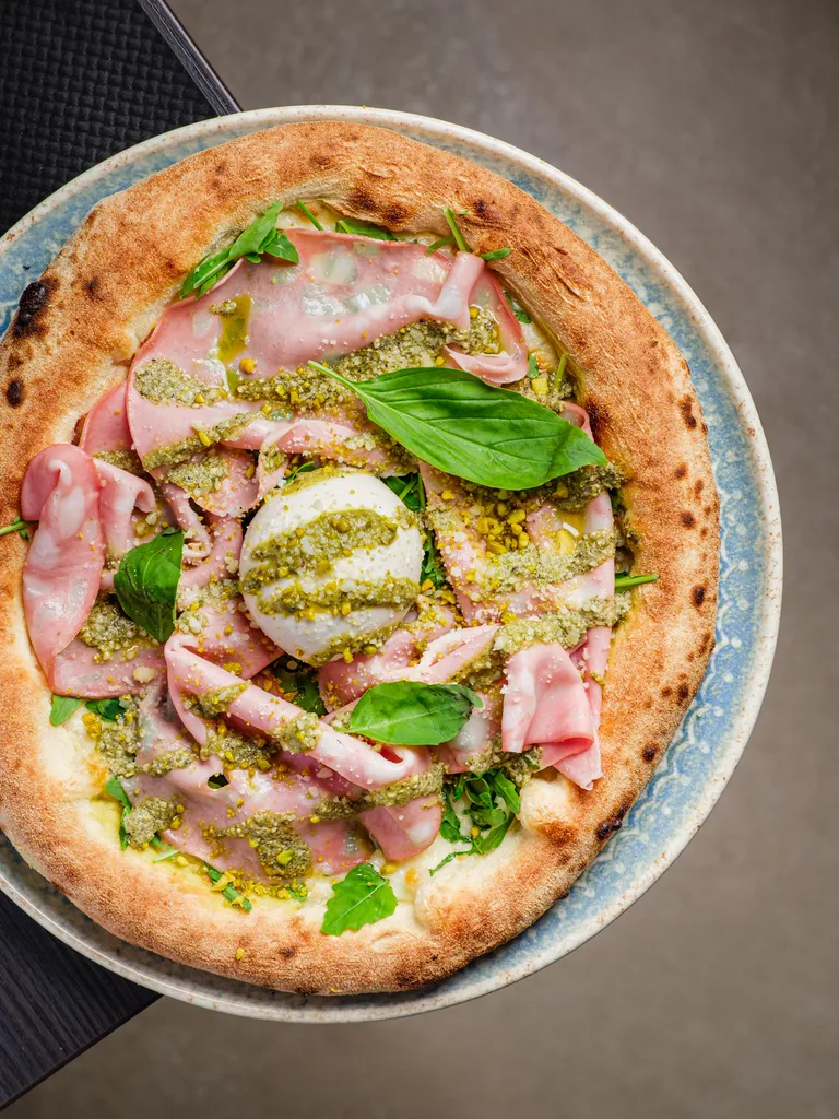 Fior di Latte, roquette, basilic, mortadelle, pistache, pesto vert, burrata.